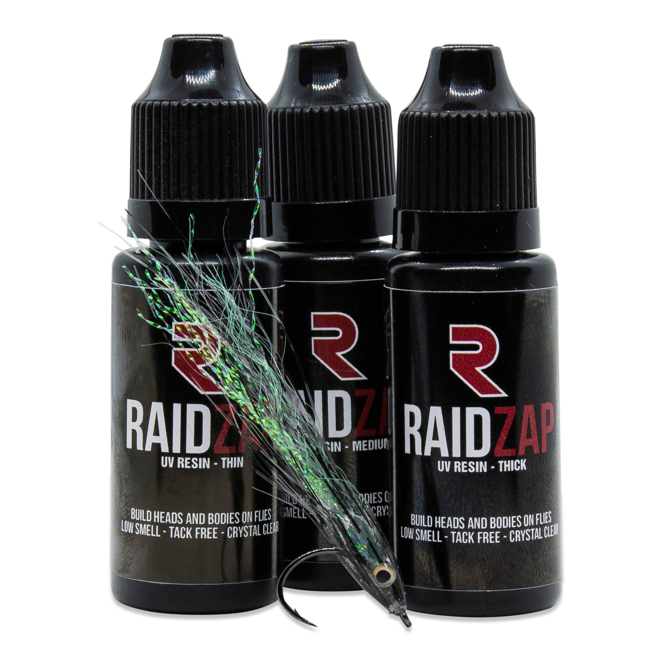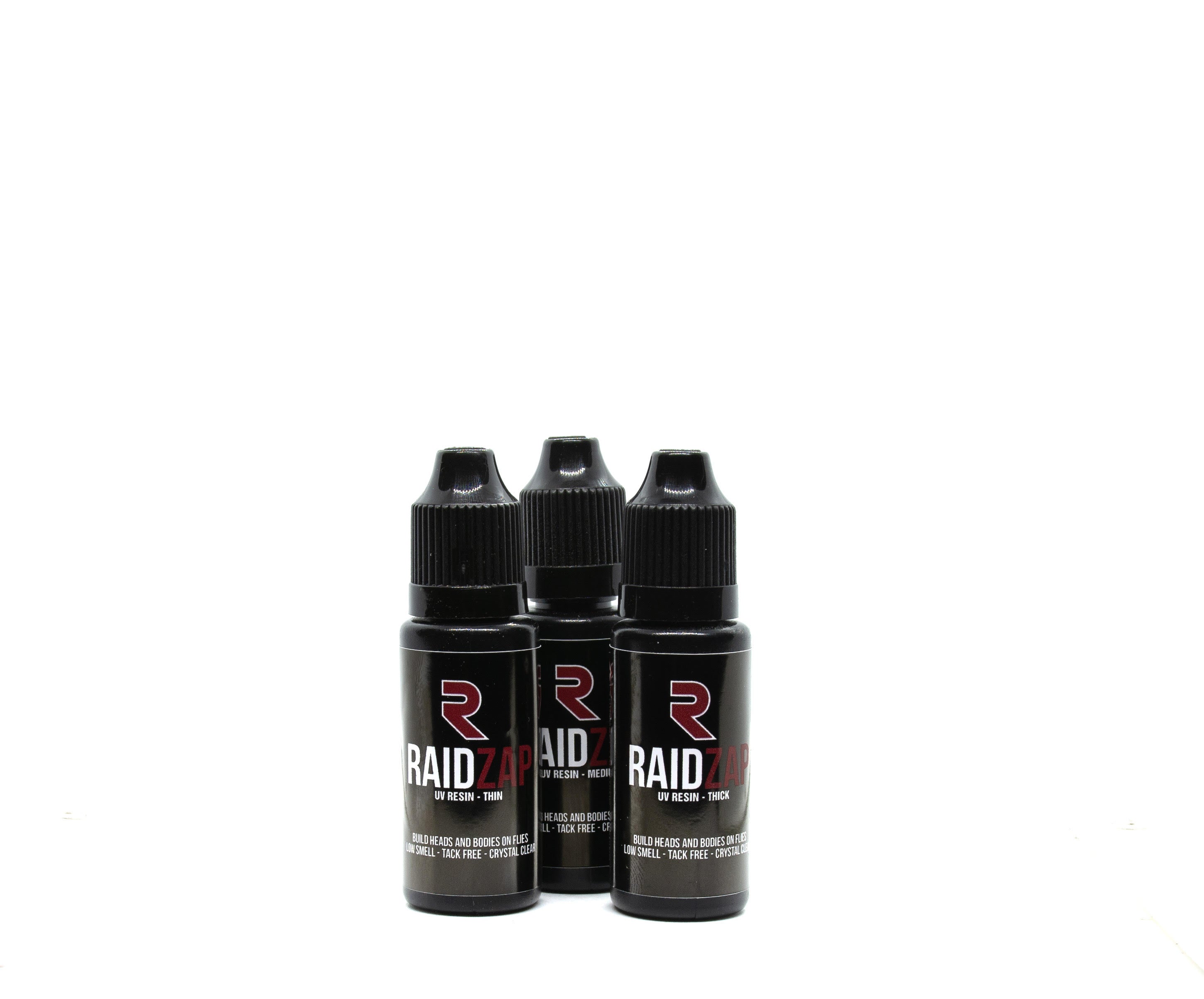 MEDIUM - build heads and bodies. A clear UV resin and quick cure with RZ 365 Pro. Raidzap Medium has a normal viscosity, it is neither too thin nor too thick. It can handle most tasks on almost all flies. The Raidzap Medium is crystal clear. That's why Raidzap Medium is also our most recognized UV resin and our best-selling UV resin for tying.