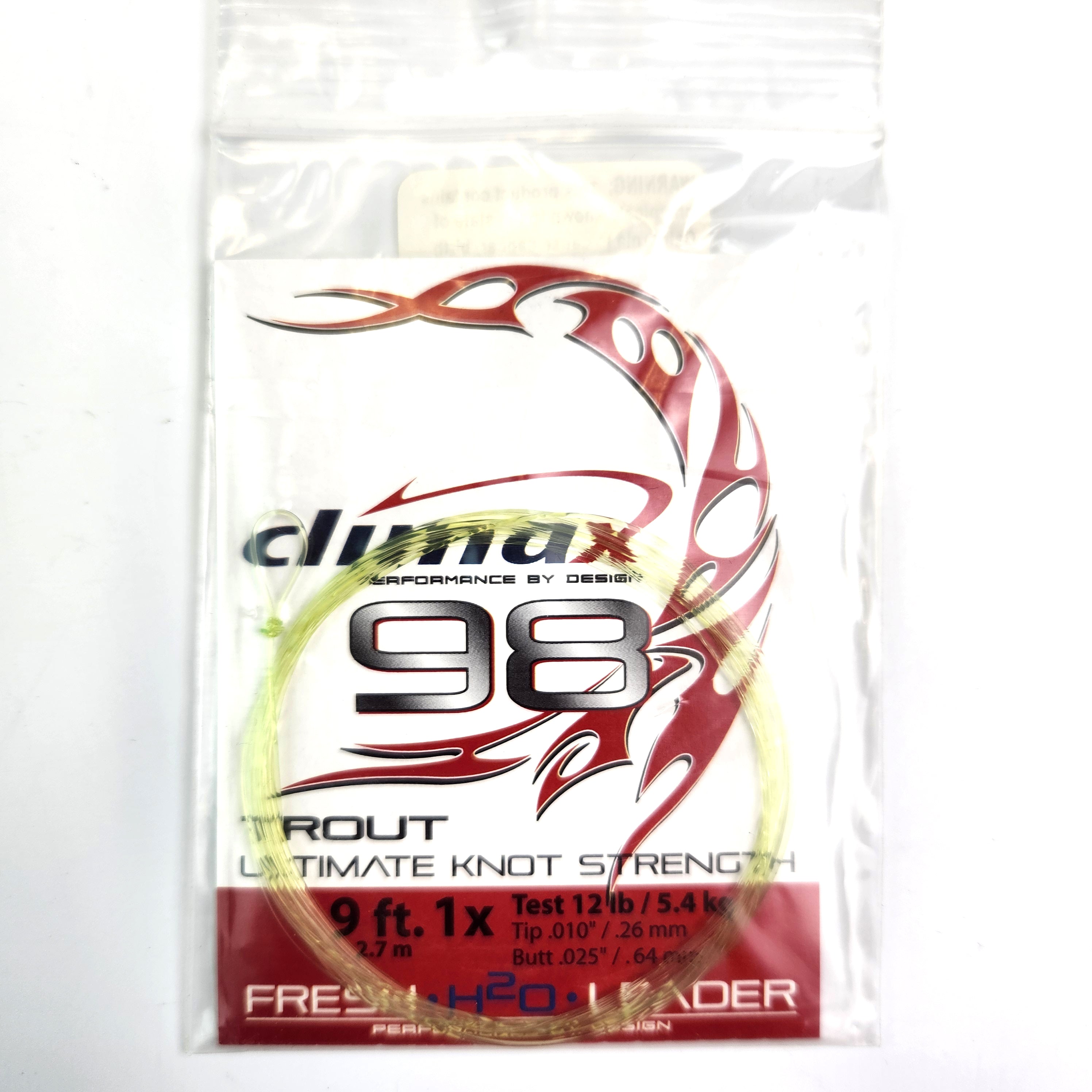 Well known for decades as a specialist and innovator in leader material technology, Climax is proud to present the Climax 98 Freshwater leader series. A slick, abrasion resistant copolymer tapered leader that maintains tremendous strength when knitted. Designed with a powerful butt section for positive turnover and a generous tippet section for natural presentation, Climax 98 Freshwater leaders boast a 30% maximum elasticity to absorb shock when landing trophy sized fish.