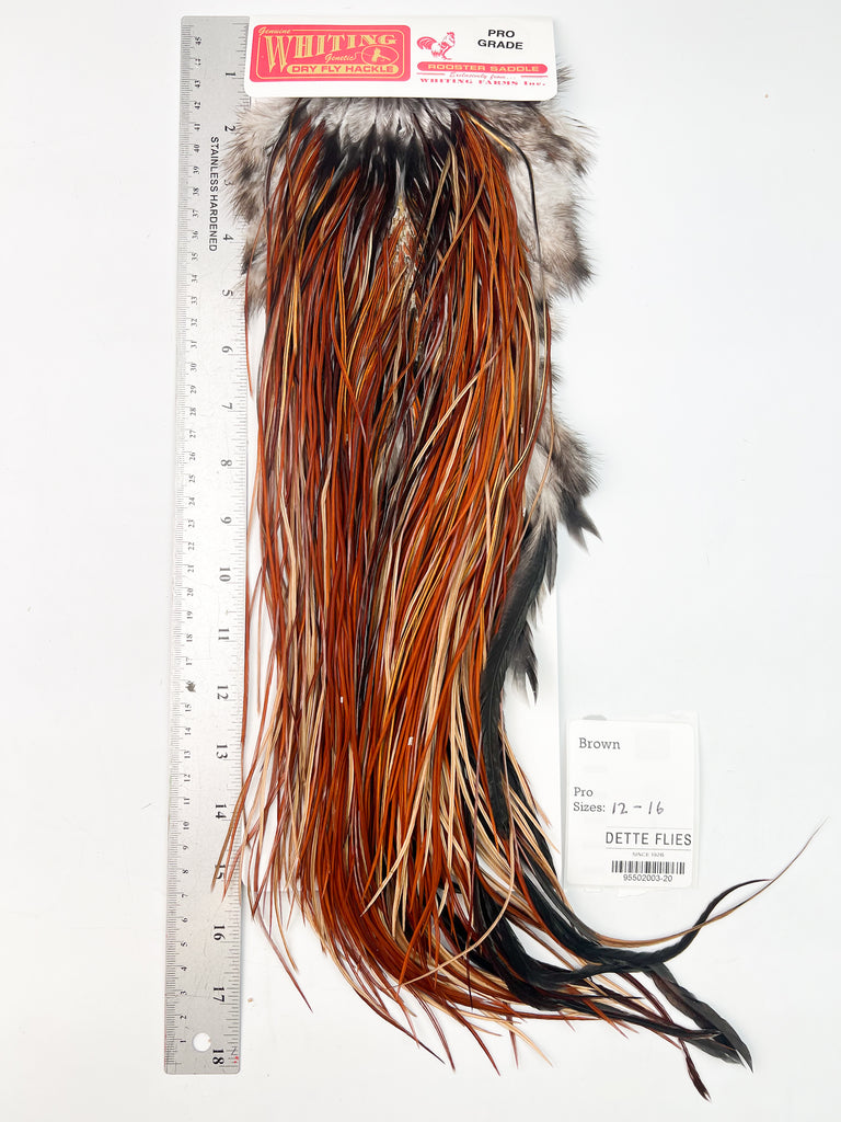 The ultimate dry fly cape or saddle! The Whiting line has the stiffest, most dense hackle for tying the best floating dry flies in the world. Each saddle is unique in its shade and variation, giving the tyer many options.