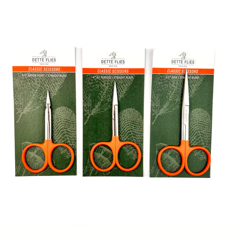 The classic fly tying scissors. Sharp, stainless steel, oversized finger holes, one side serrated.