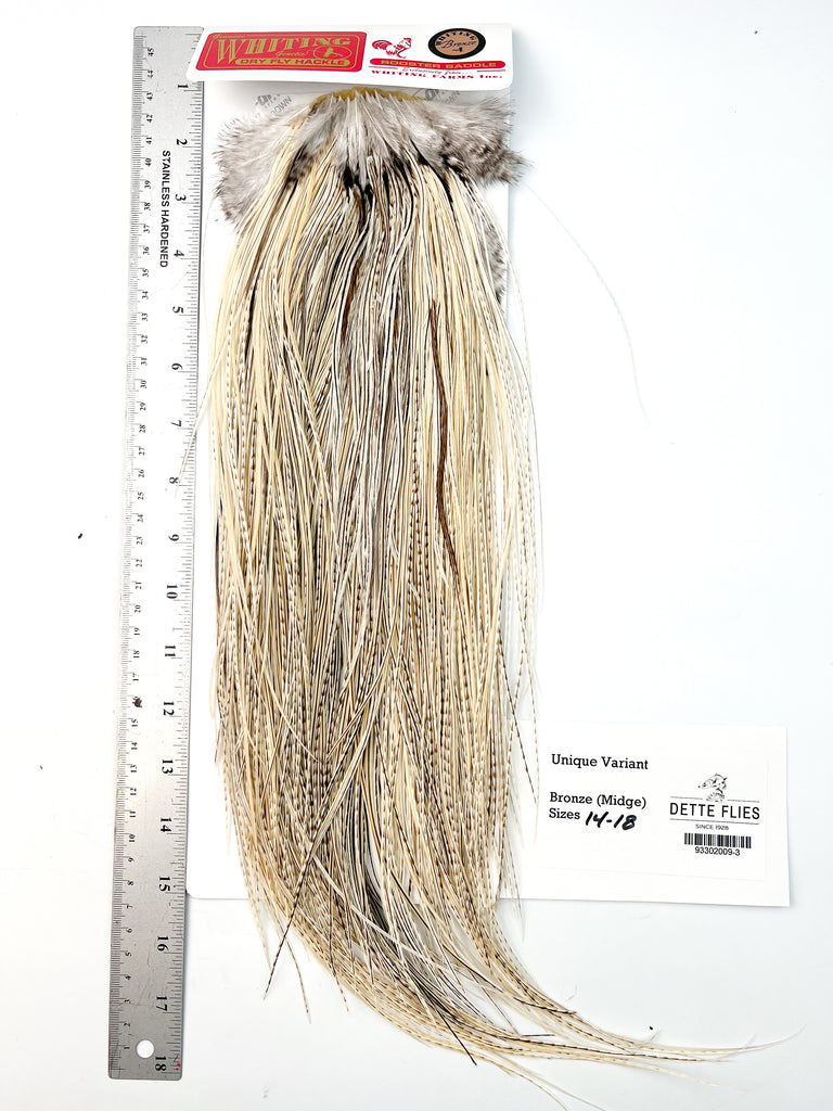 The ultimate dry fly cape or saddle! The Whiting line has the stiffest, most dense hackle for tying the best floating dry flies in the world. Each saddle is unique in its shade and variation, giving the tyer many options.
