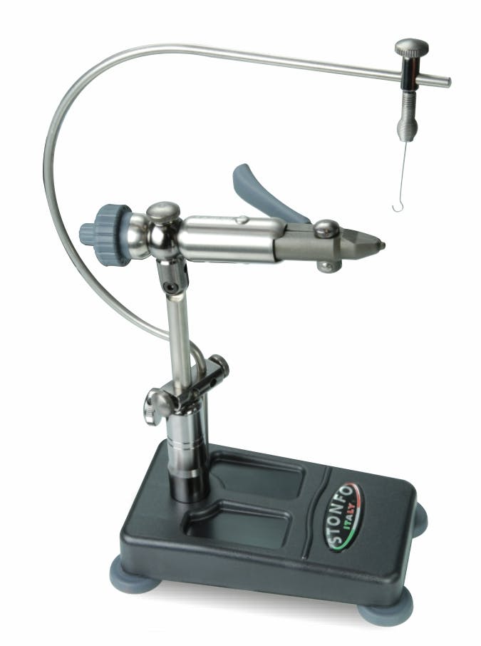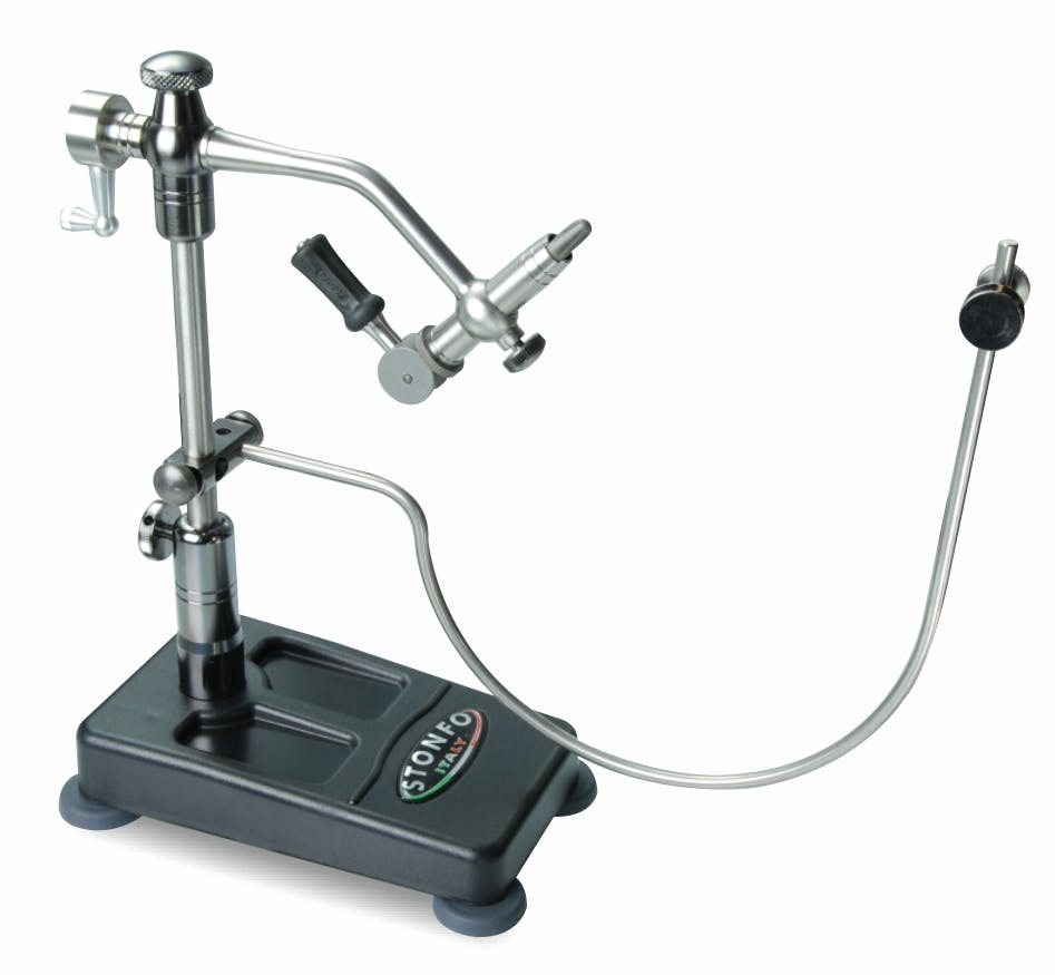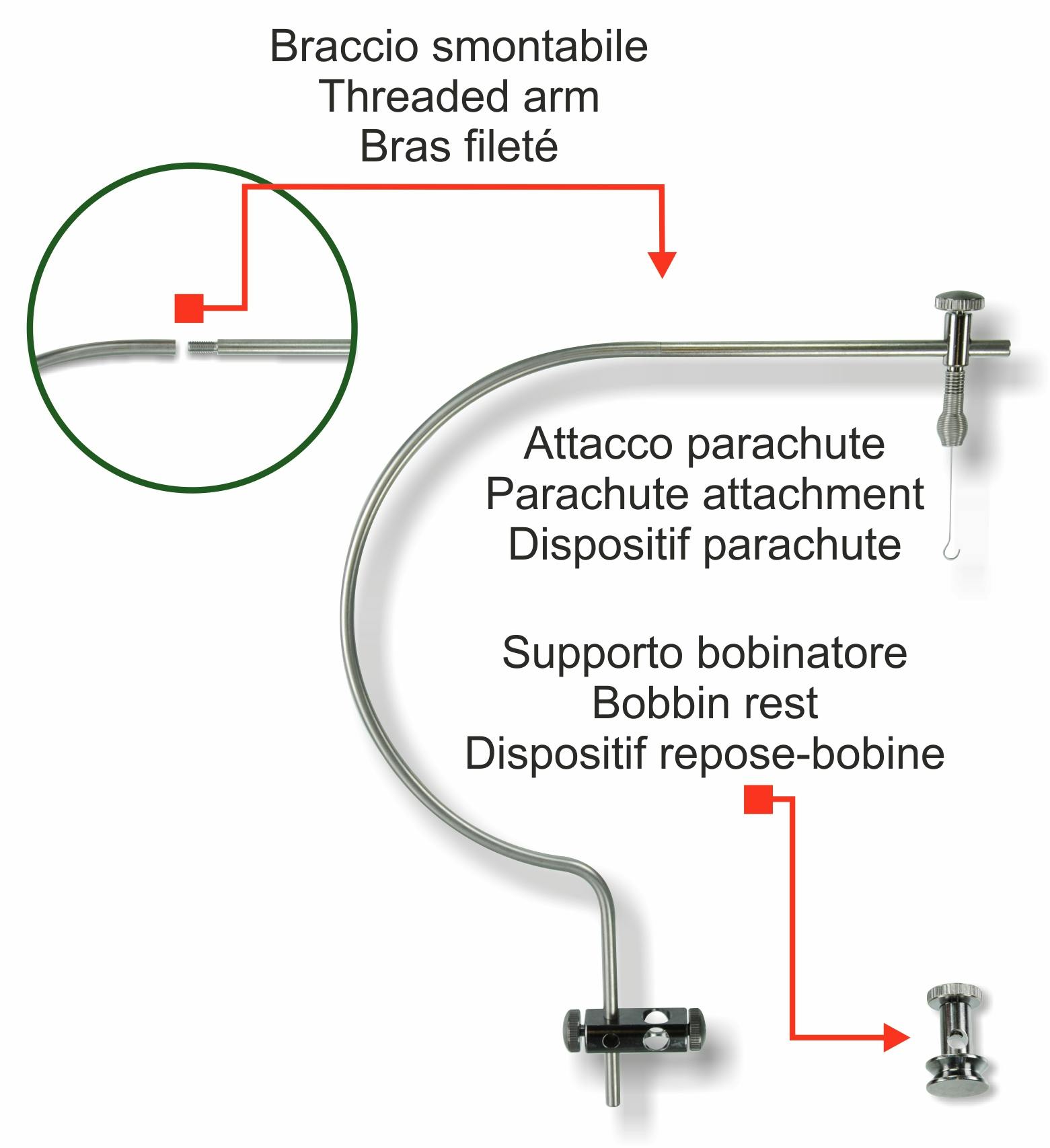 Stainless steel tool adjustable in every direction. Fits all vises with stem from 8 to 10 mm. This tool is designed to be used as a “parachute” attachment or a bobbin rest. Its rounded shape provides ample room to work.