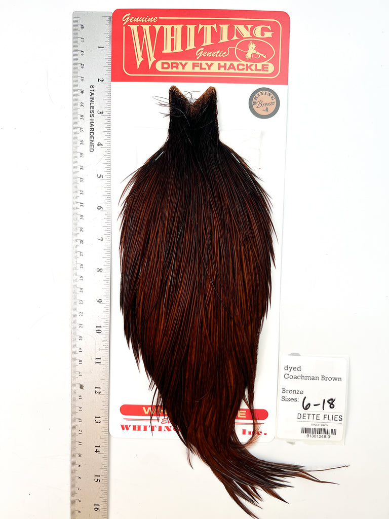 The ultimate dry fly cape or saddle! The Whiting line has the stiffest, most dense hackle for tying the best floating dry flies in the world. Each cape is unique in its shade and variation, giving the tyer many options.