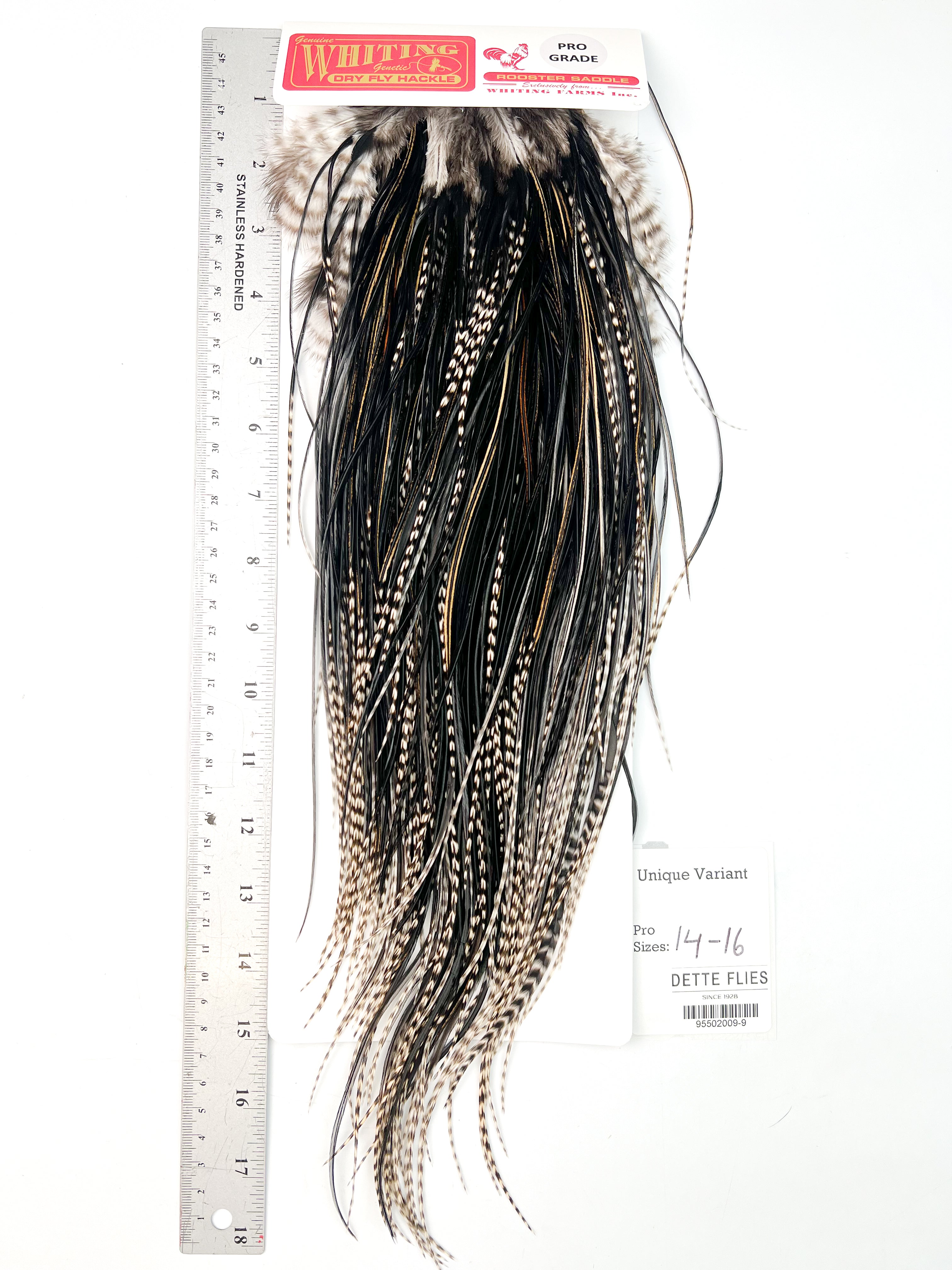 The ultimate dry fly cape or saddle! The Whiting line has the stiffest, most dense hackle for tying the best floating dry flies in the world. Each saddle is unique in its shade and variation, giving the tyer many options.