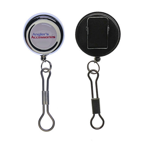 The original zinger-type retractor. A heavy-duty case and sturdy gripping clamp in two different finishes, as well as either 16" Steelon wire cable or nylon cord.