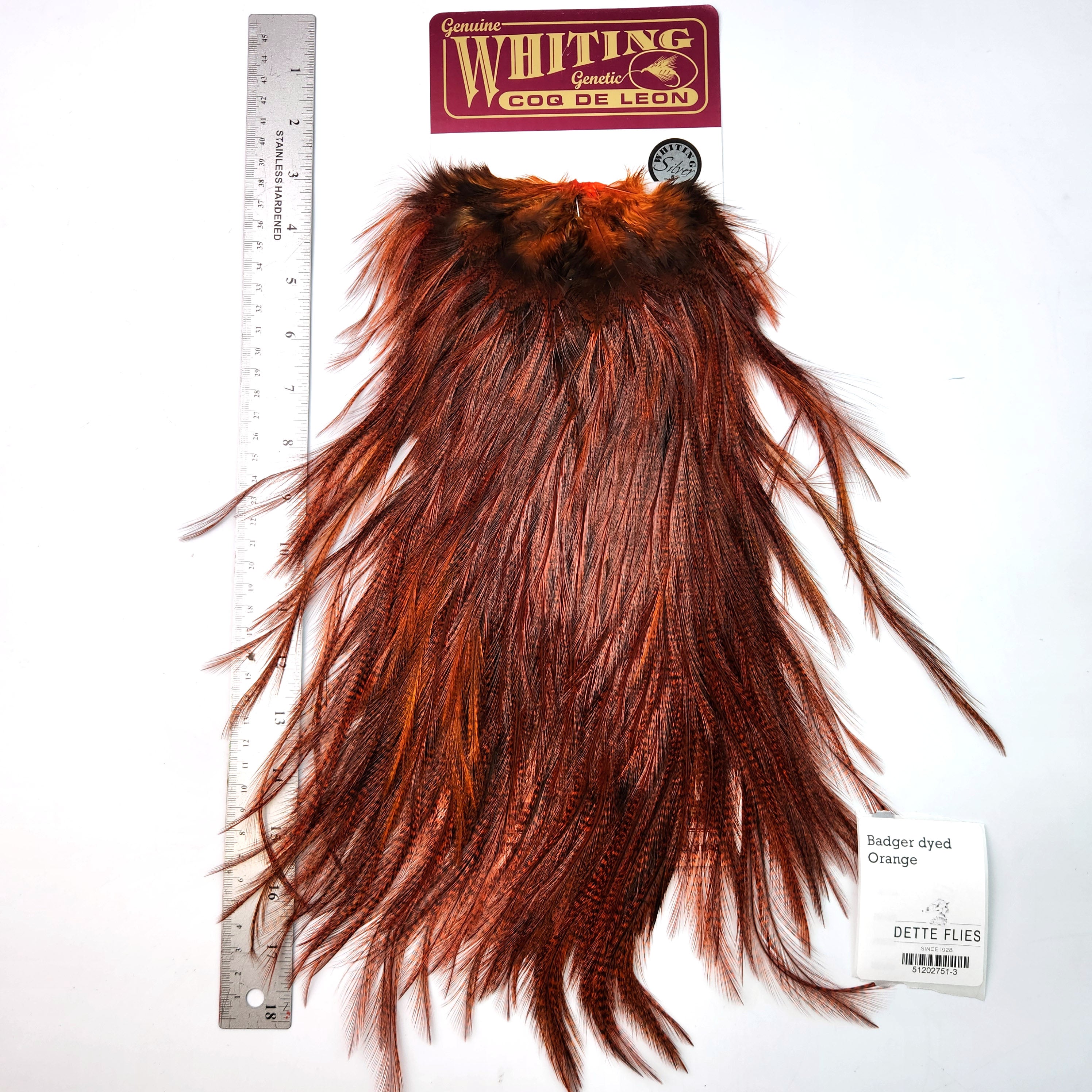 Whiting Coq de Leon line of hackle is prized for the long glossy barbs. It is widely used for tailing of both dry flies and nymph. It also is fantastic for hackle collars and winging.