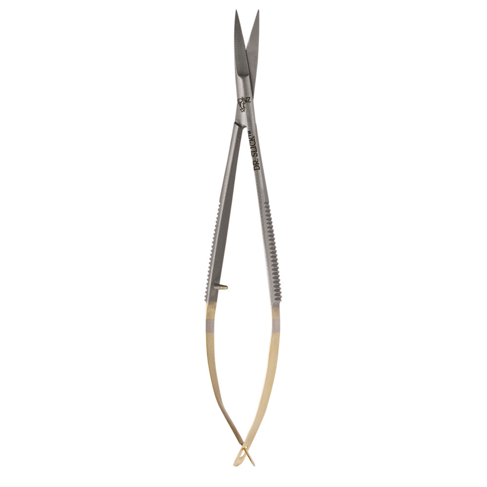 The ultimate one-hand wonder! No loops, just squeeze the spring arms together and the blades cut. Great scissor for detail work and in-hand tying. Excellent with natural materials and can handle most synthetics.