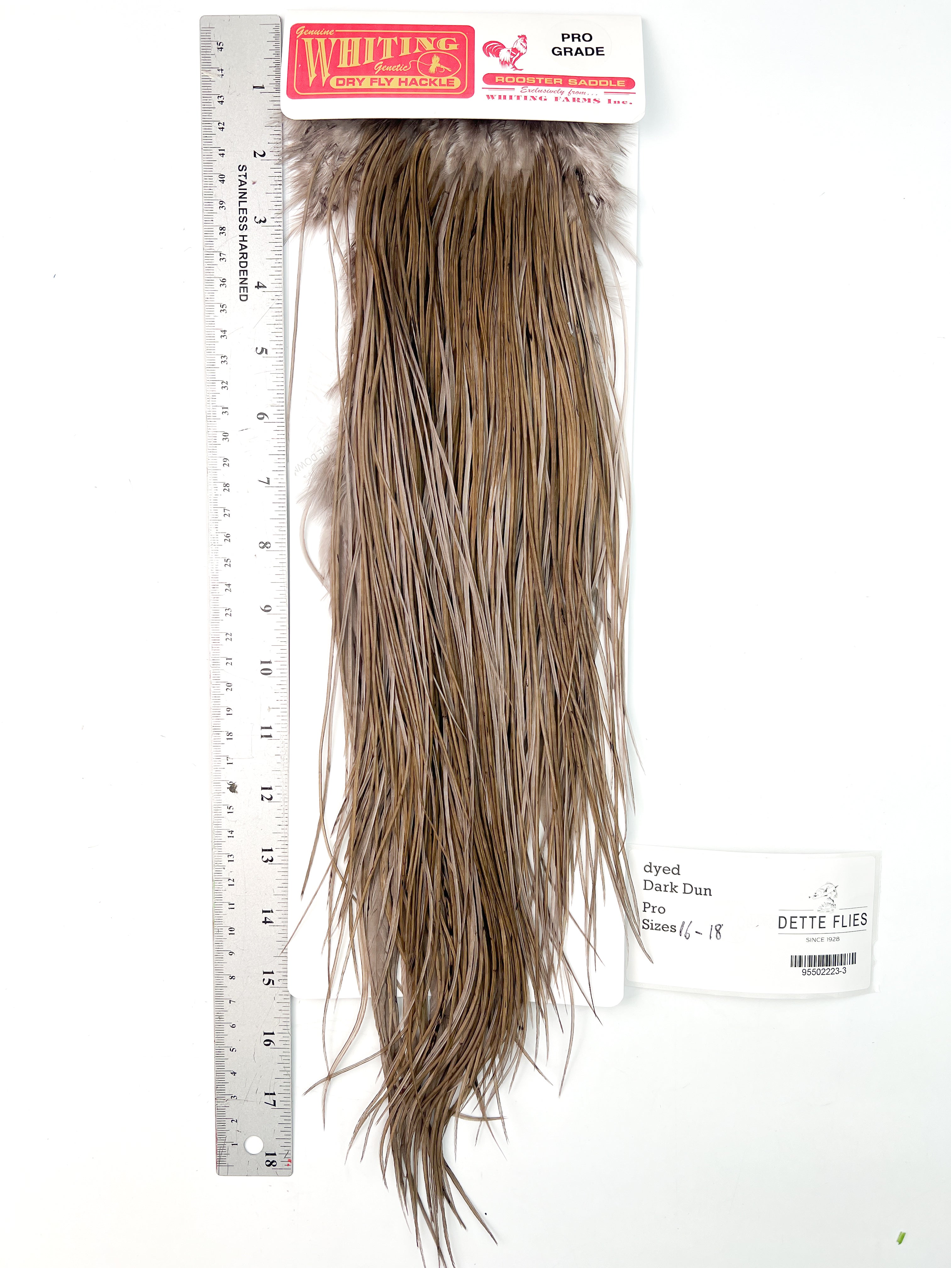 The ultimate dry fly cape or saddle! The Whiting line has the stiffest, most dense hackle for tying the best floating dry flies in the world. Each saddle is unique in its shade and variation, giving the tyer many options.