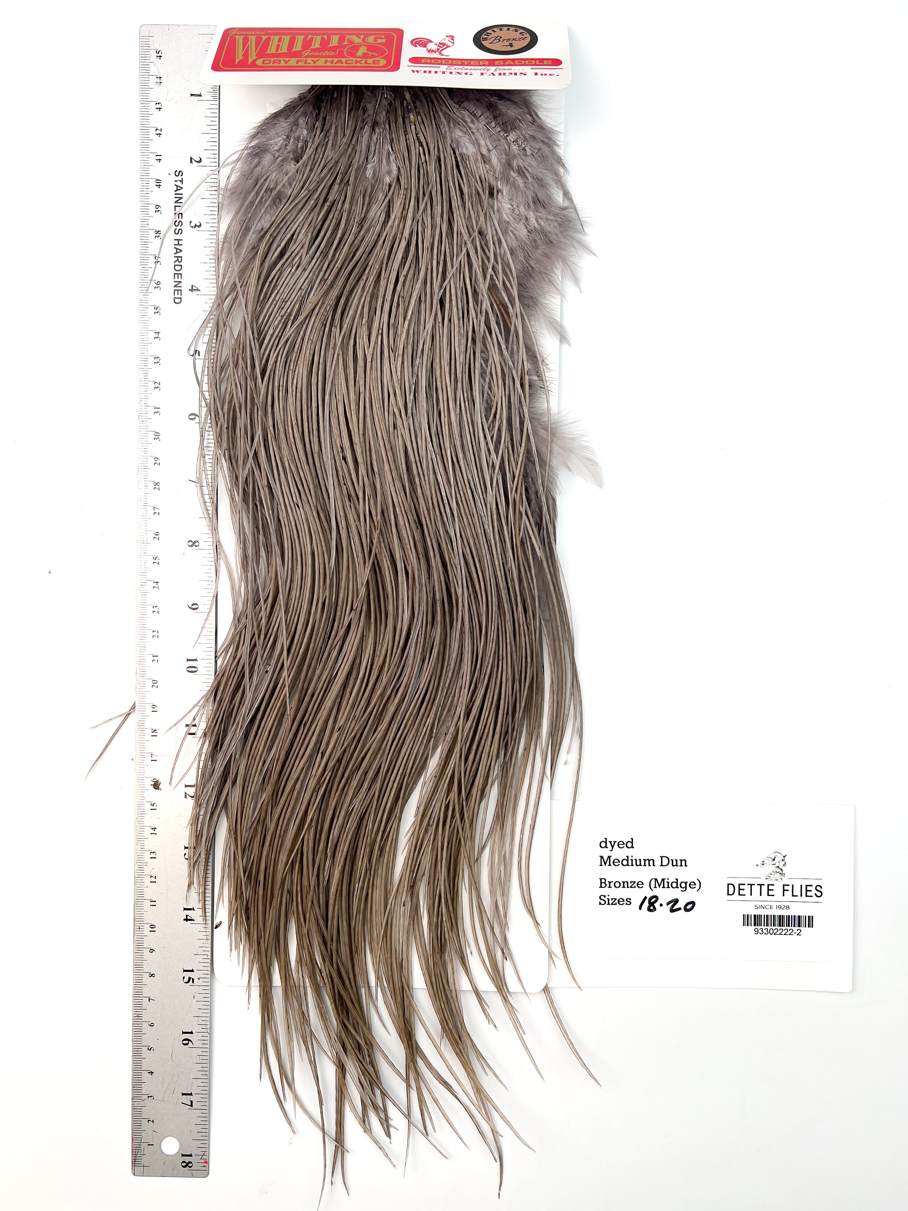 The ultimate dry fly cape or saddle! The Whiting line has the stiffest, most dense hackle for tying the best floating dry flies in the world. Each saddle is unique in its shade and variation, giving the tyer many options.