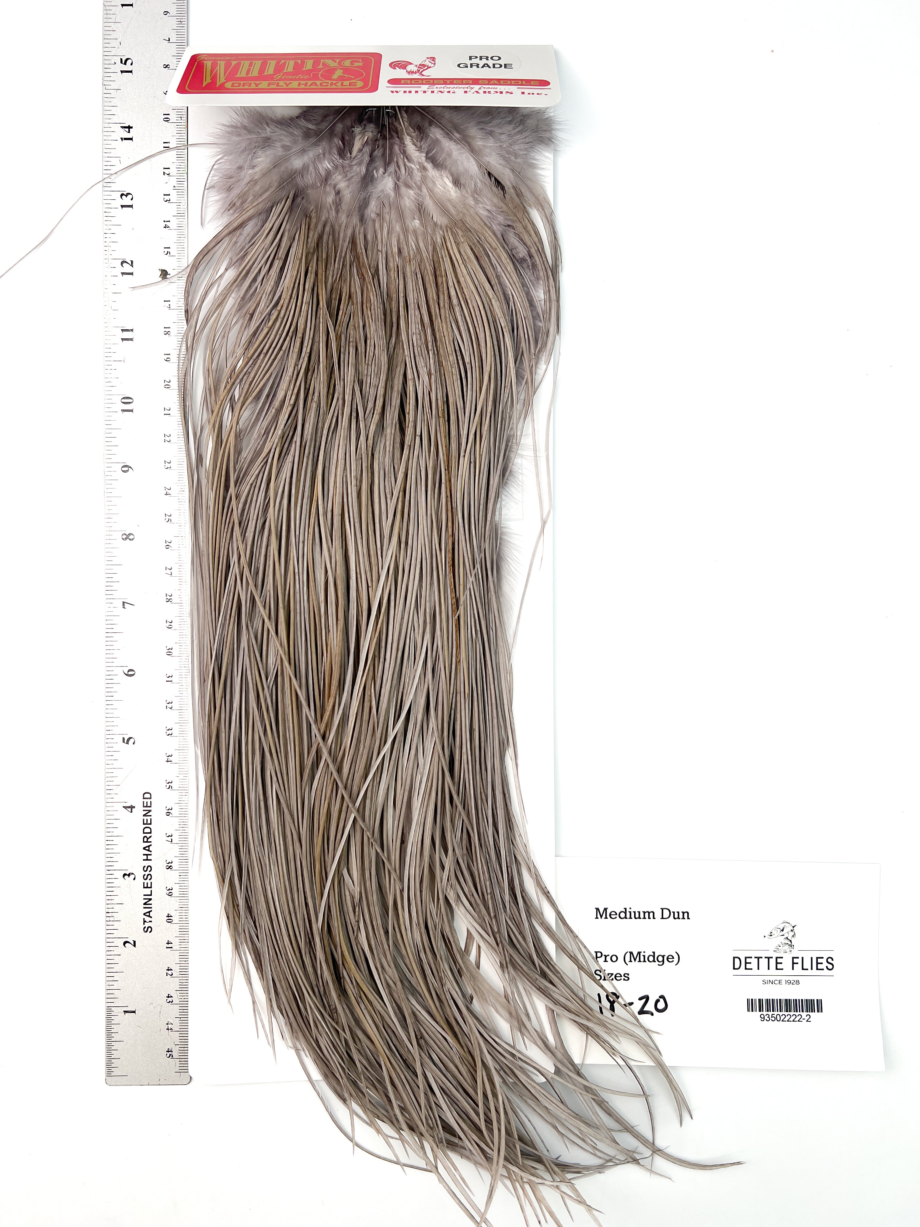The Whiting Midge line has the stiffest, most dense hackle for tying the best floating dry flies in the world in sizes normally only found on a cape. Each saddle is unique in its shade and variation, giving the tyer many options.