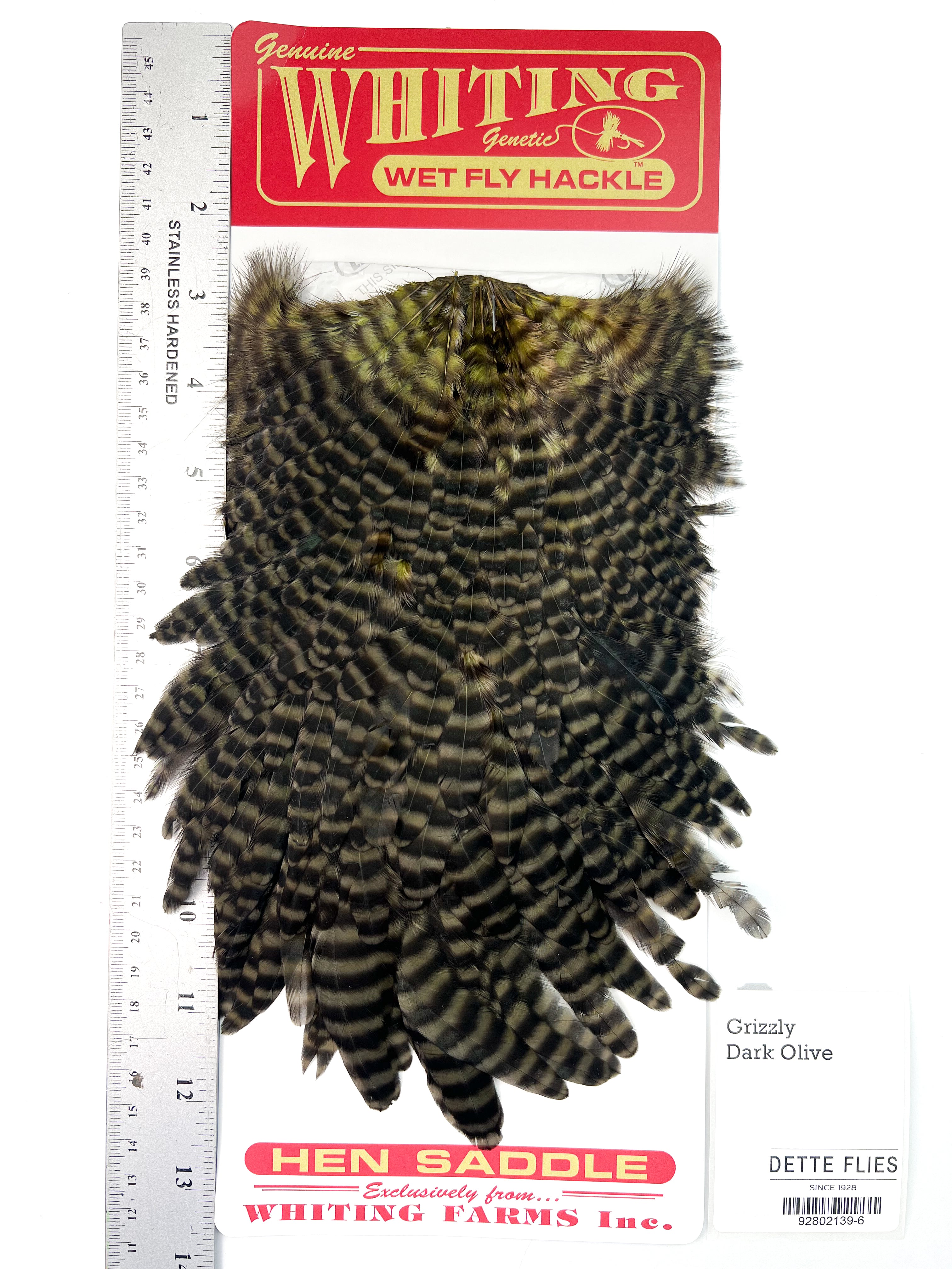Grizzly dyed Dark Olive - Whiting Line Hen Saddle (#6)