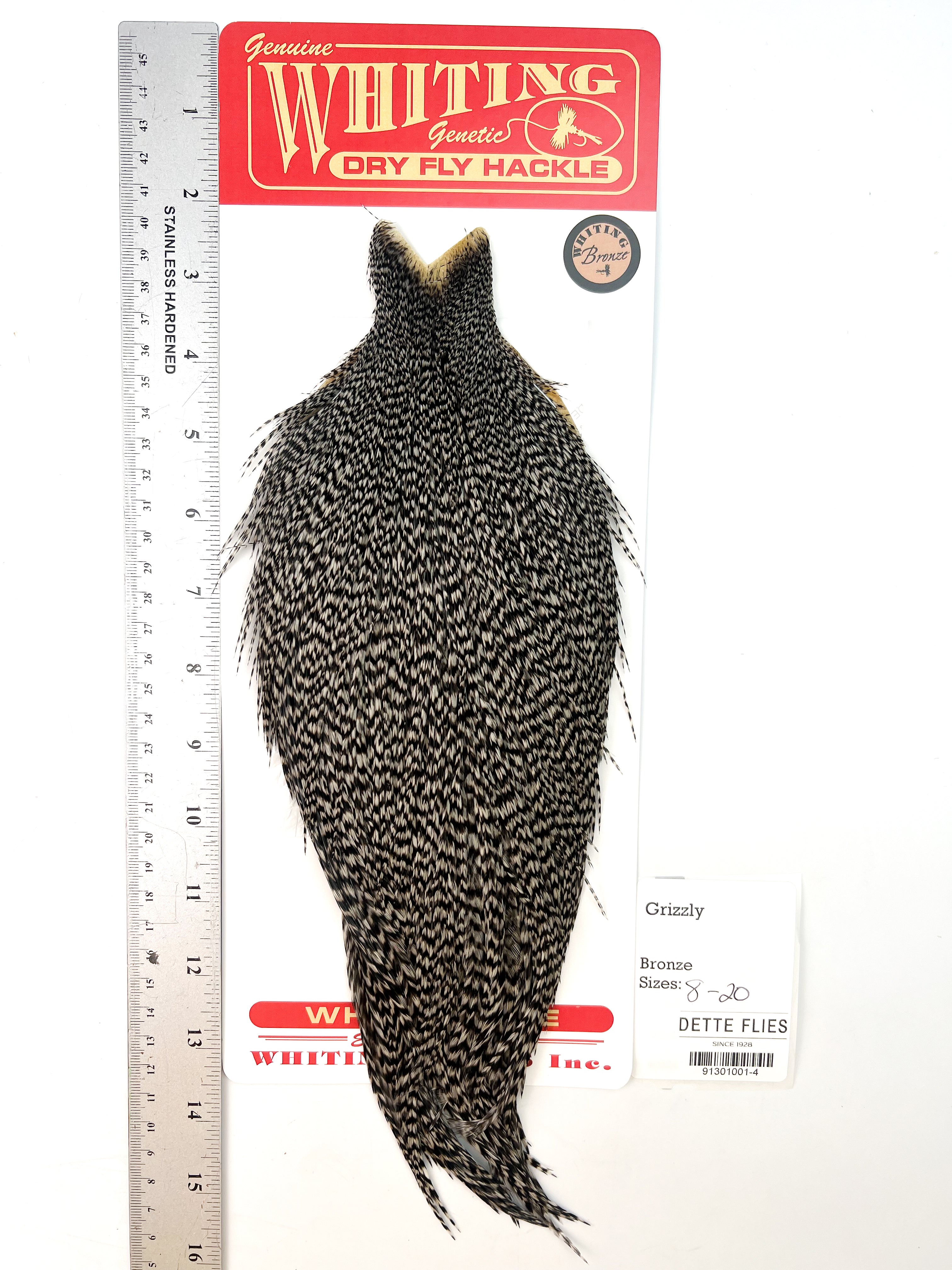 The ultimate dry fly cape or saddle! The Whiting line has the stiffest, most dense hackle for tying the best floating dry flies in the world. Each cape is unique in its shade and variation, giving the tyer many options.