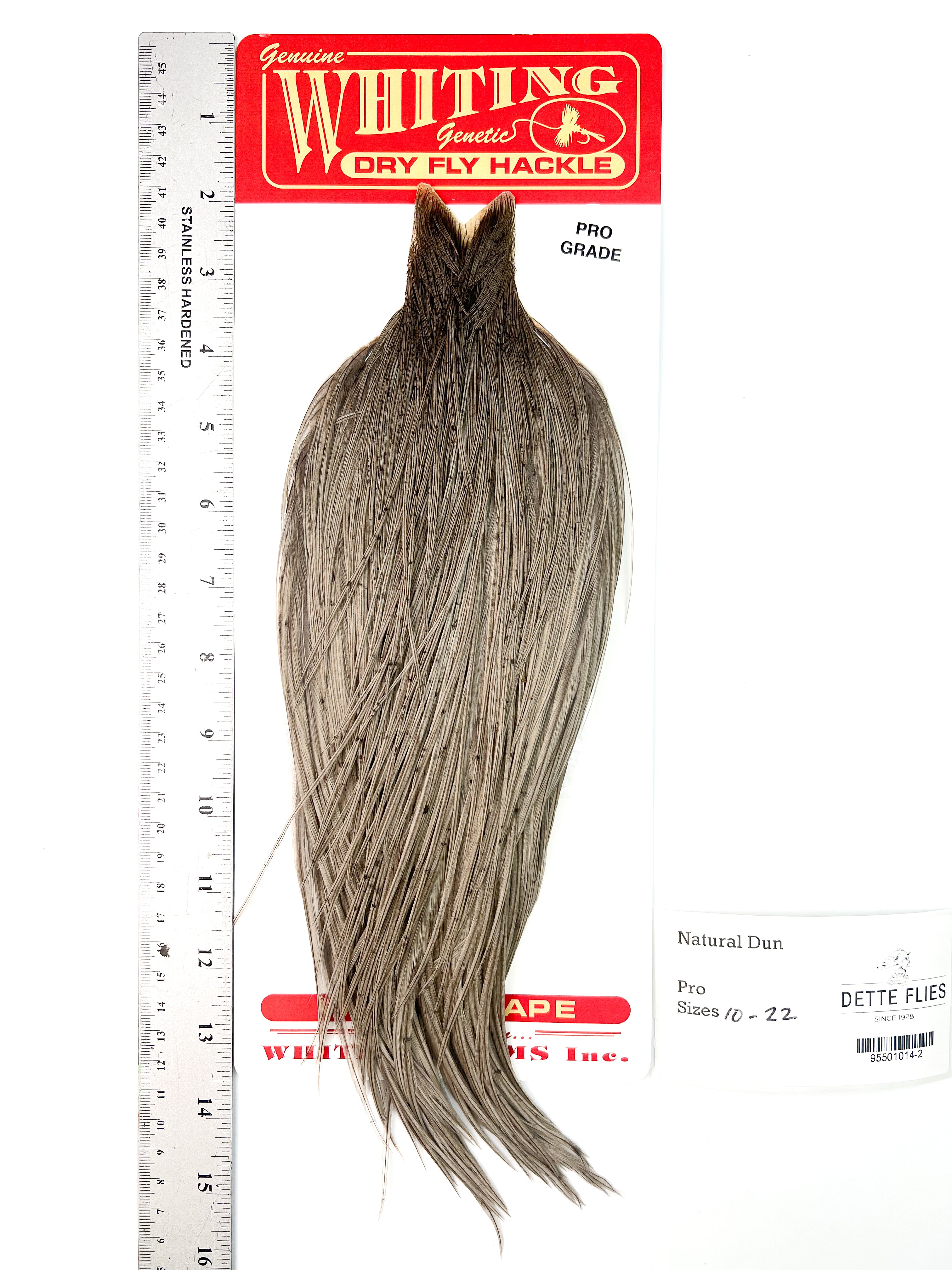 The ultimate dry fly cape or saddle! The Whiting line has the stiffest, most dense hackle for tying the best floating dry flies in the world. Each cape is unique in its shade and variation, giving the tyer many options.