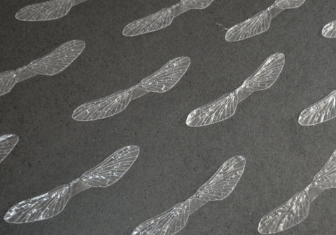 Spinner wings are designed to tie imago mayfly p-atterns. The wings are translucent and can be tinted with graphic marker pens to match any species. The wings can be tied in both the upright and flat, spent positions. THese wings also work well as posts for parachute and klinhammer patterns.
