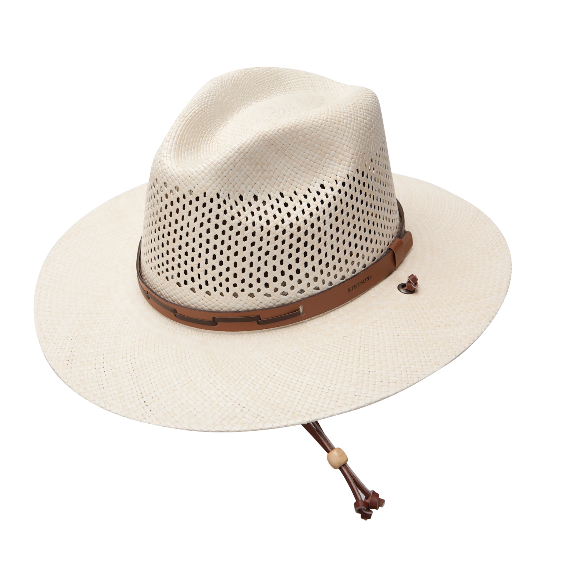 The Airway Panama Safari Hat is constructed of grade 3 genuine panama straw and features a dri-lex interior sweatband, uv underbrim, bonded leather hat brim, leather chin cord with toggle and vented crown.