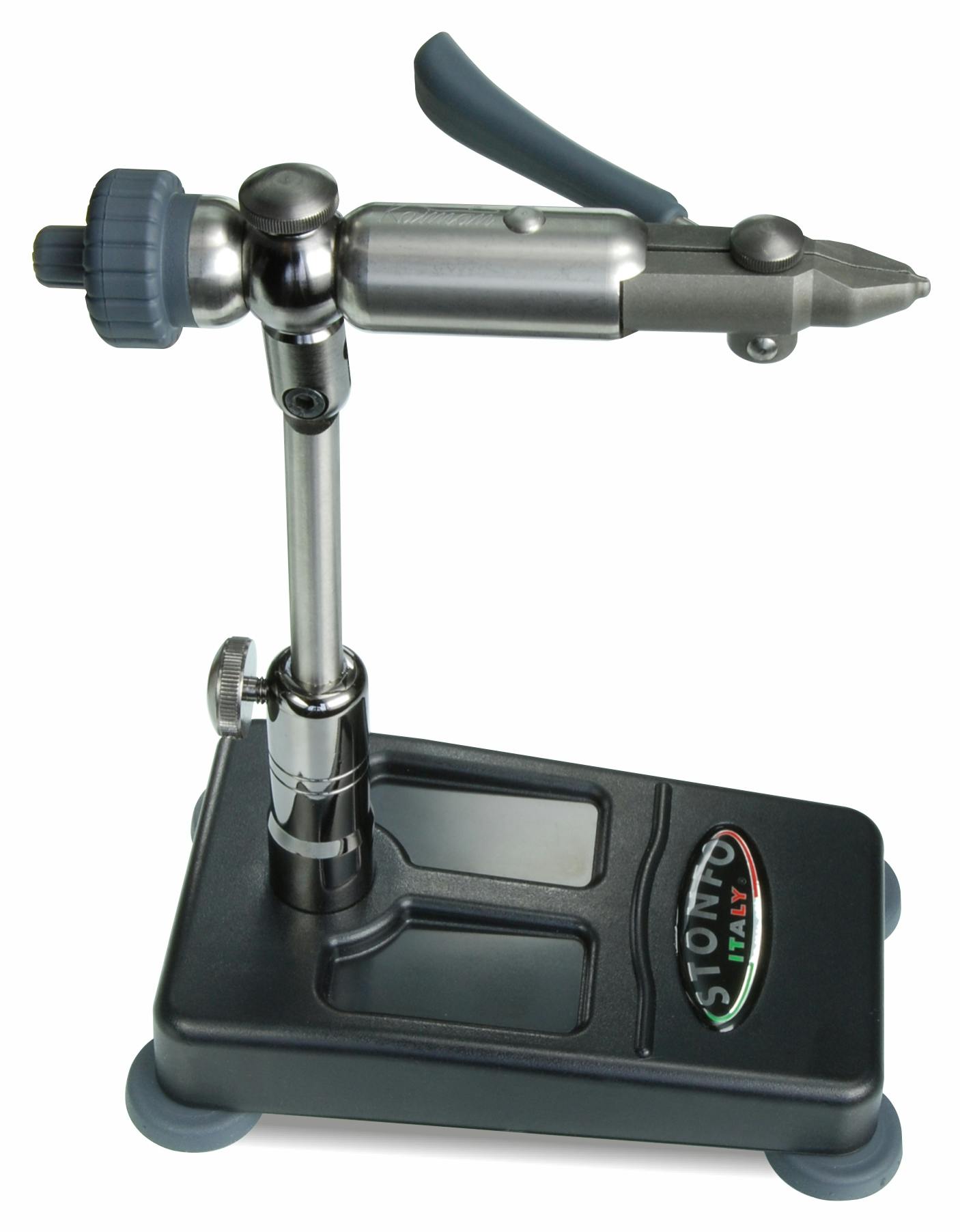 High precision vise for a fast hook changing. To use simply squeeze the lever and insert the hook into the jaw. When you release the lever the hook will be held firmly in the vise. The hardened steel jaw is designed to hold hooks ranging from tiny size 28 to mighty 5/0 saltwater hooks with no adjustments. Other features: lever with anatomic handle, 360° rotary action with dual precision ball bearings, double diameter handwheel, adjustable rotary tension, locking position 0°-180°, adjustable tying angle, adjustable height. The lever can be set up for both left and right handed use.