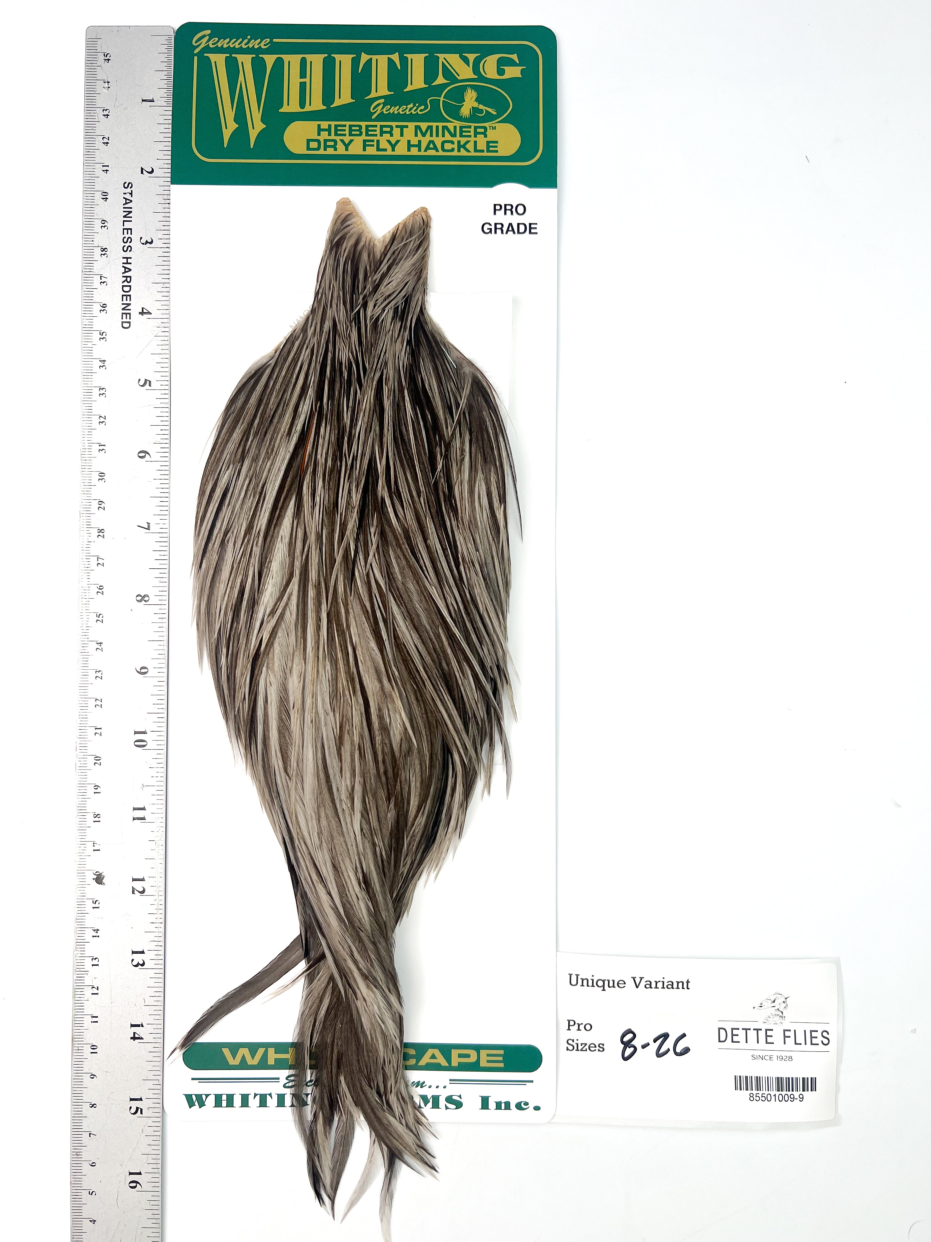 The Whiting Farms Hebert Miner hackle series is bar none for natural colors and quality feathers with great barb counts. Each cape is unique in its shade and variation, giving the tyer many options for a variety of flies from standard dry flies, emergers and cripples, to classic wet flies, soft hackles, and nymphs.