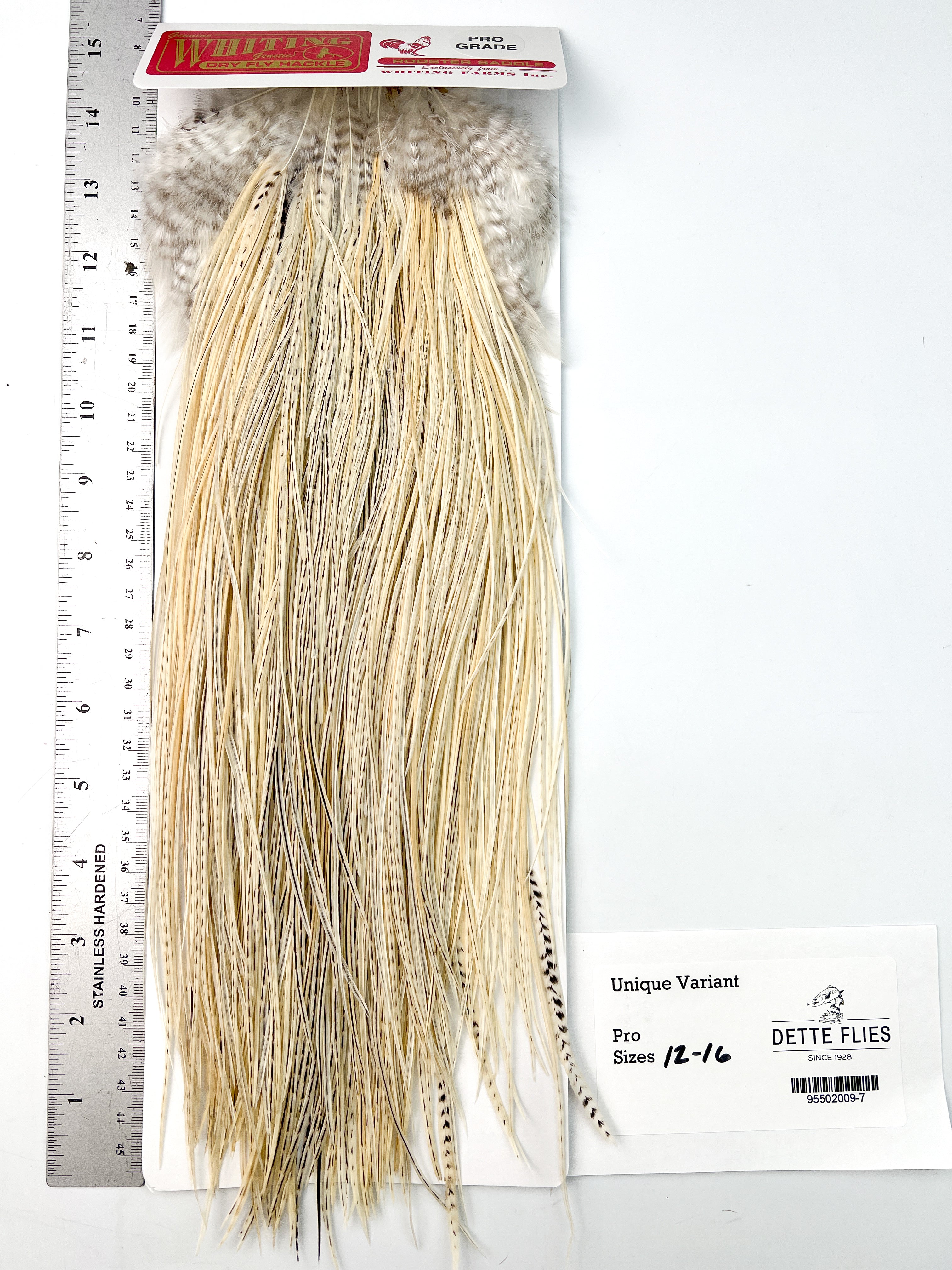 The ultimate dry fly cape or saddle! The Whiting line has the stiffest, most dense hackle for tying the best floating dry flies in the world. Each saddle is unique in its shade and variation, giving the tyer many options.