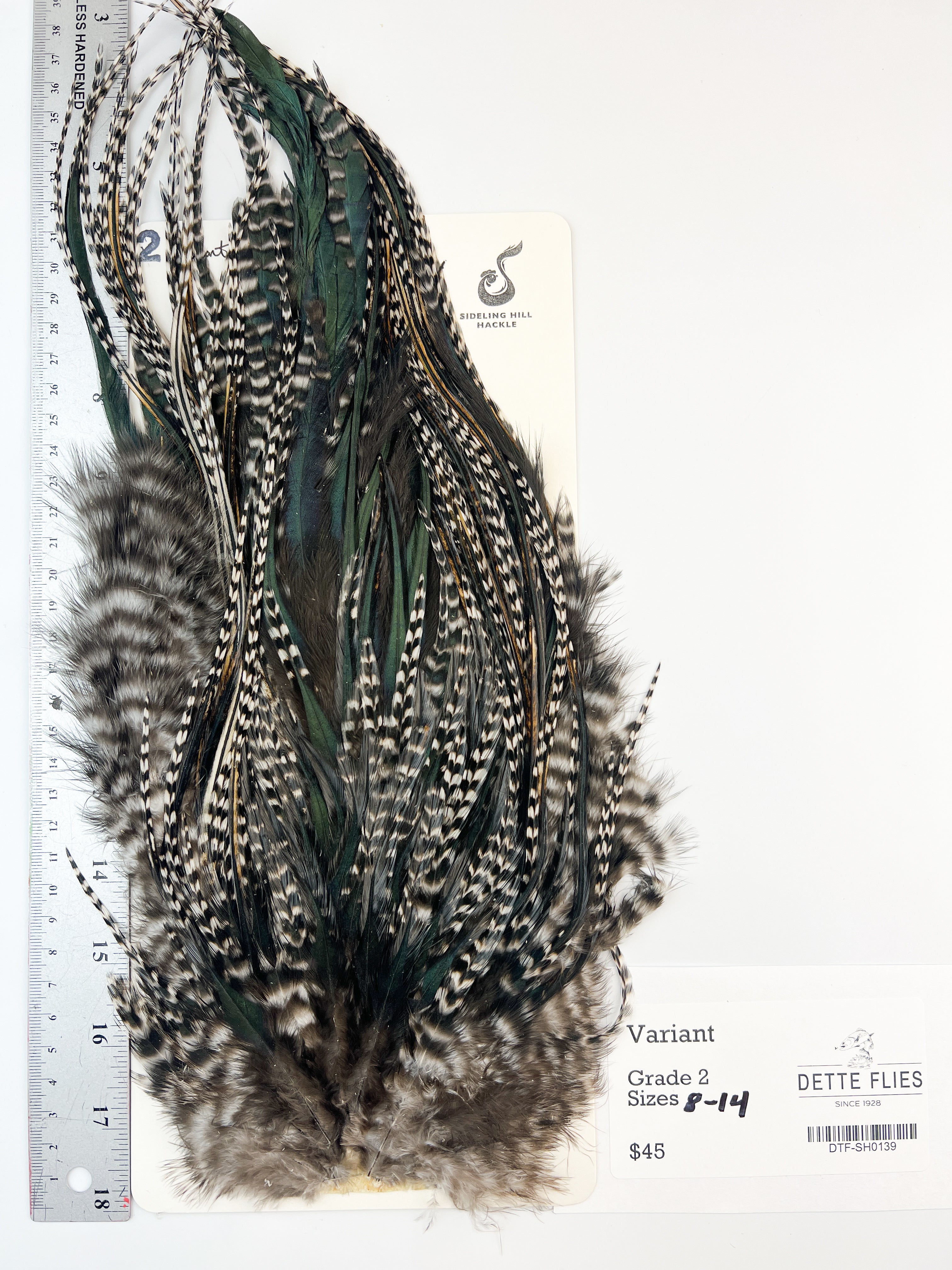 Sideling Hill Hackle is small grower in PA. It features larger sizes then other genetic hackles, stiff barbs and wraps really well.