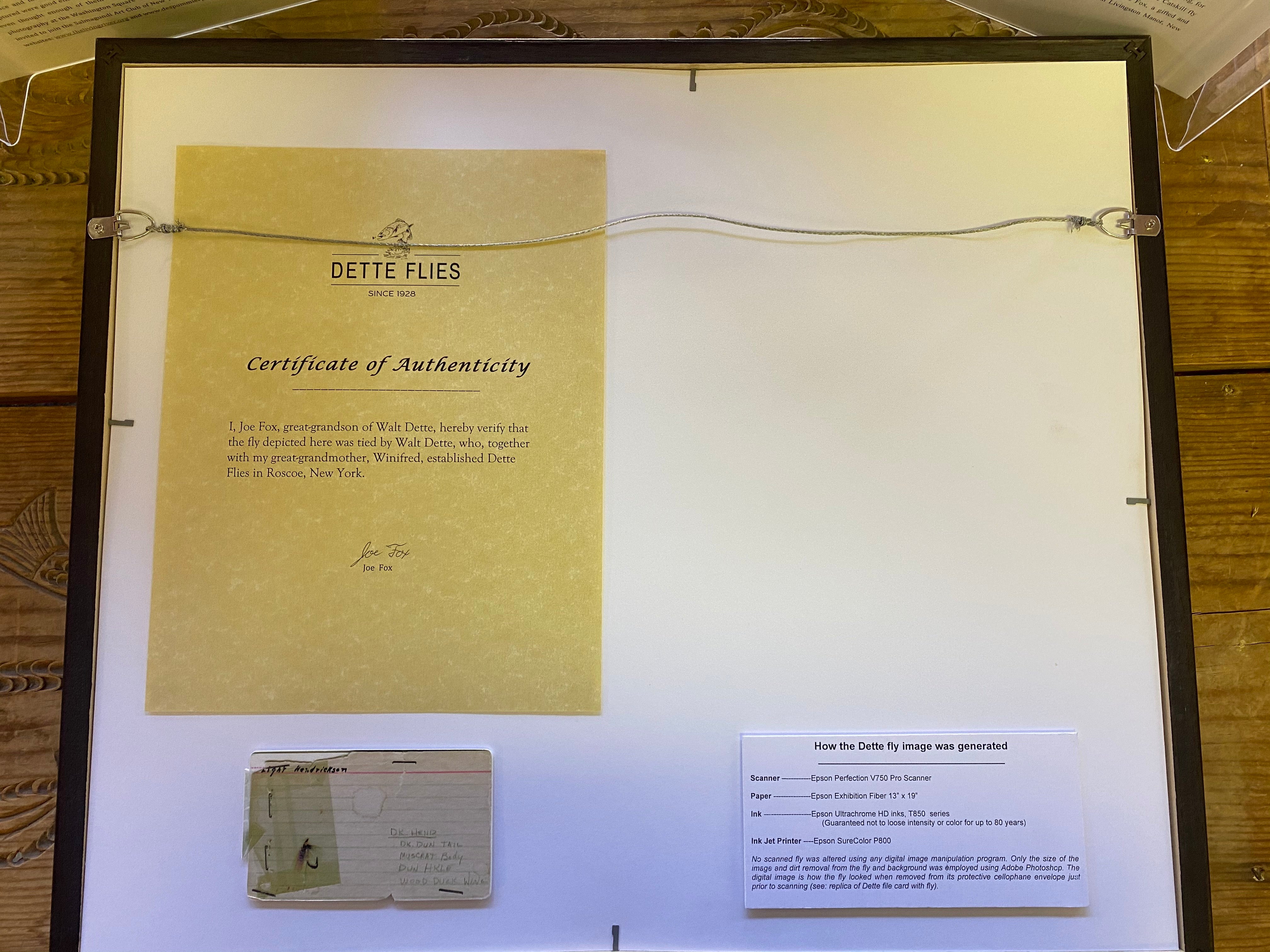 Printed images of 28 classic wet flies tied by Walt Dette have been produced, matted, signed and archived by Dickson Despommier. Each framed print will be accompanied by a certificate of authentication signed by Joe Fox, great-grandson of Walt Dette, an image of the fly in its cellophane file printed at actual size if applicable, and a description of the production methods used to produce each example.