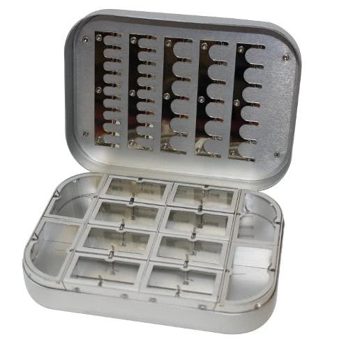1607 - Small 7s & 10s clips in lid for 58 flies. 16 compartments. 6" x 3 1/2" x 1 1/8"