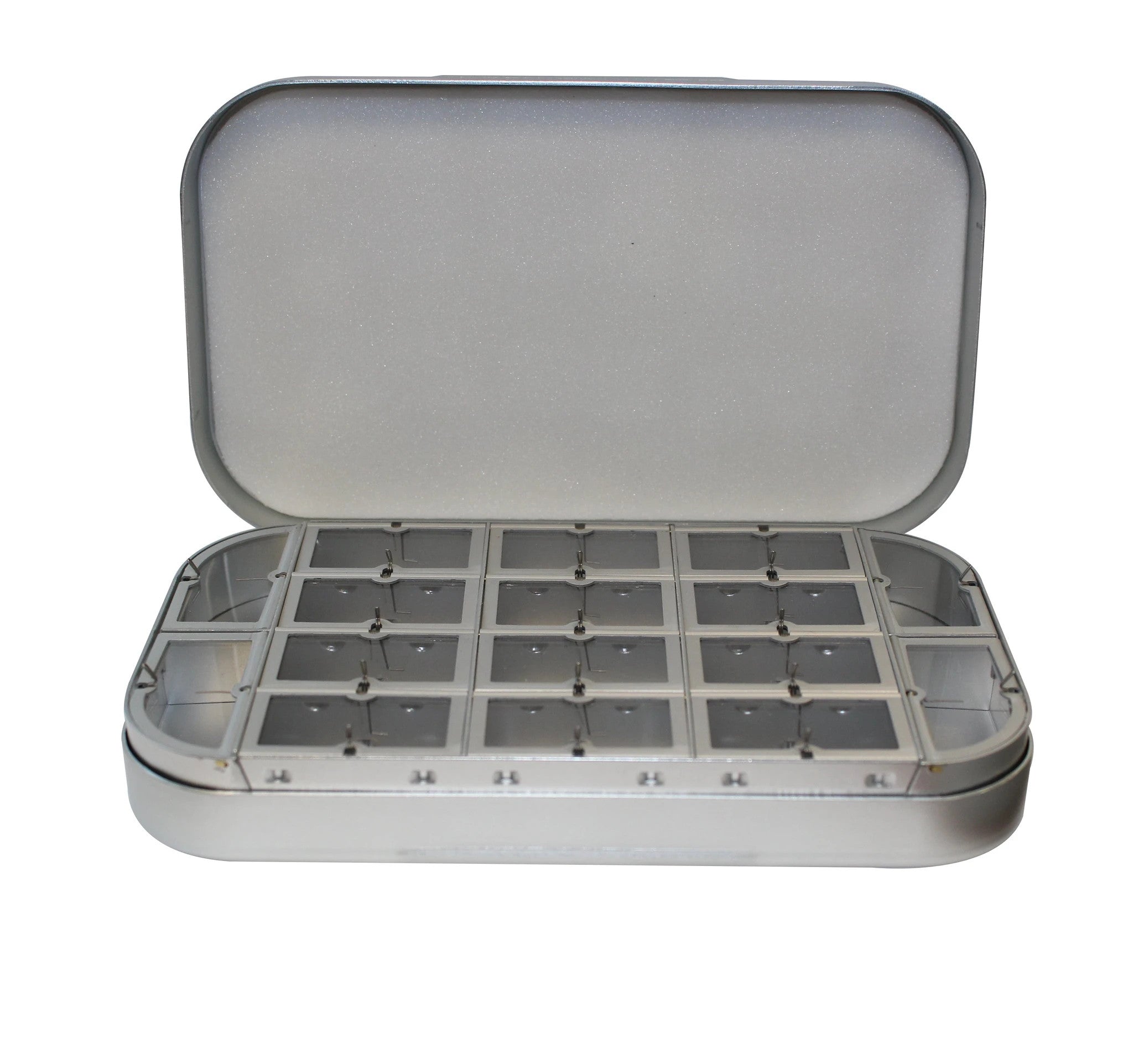 1607F - 16 compartments, flat foam in lid. 6" x 3 1/2" x 1 1/8"
